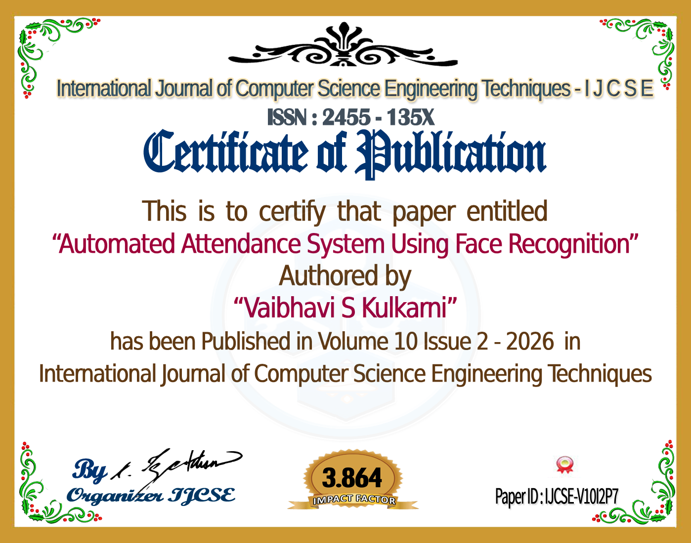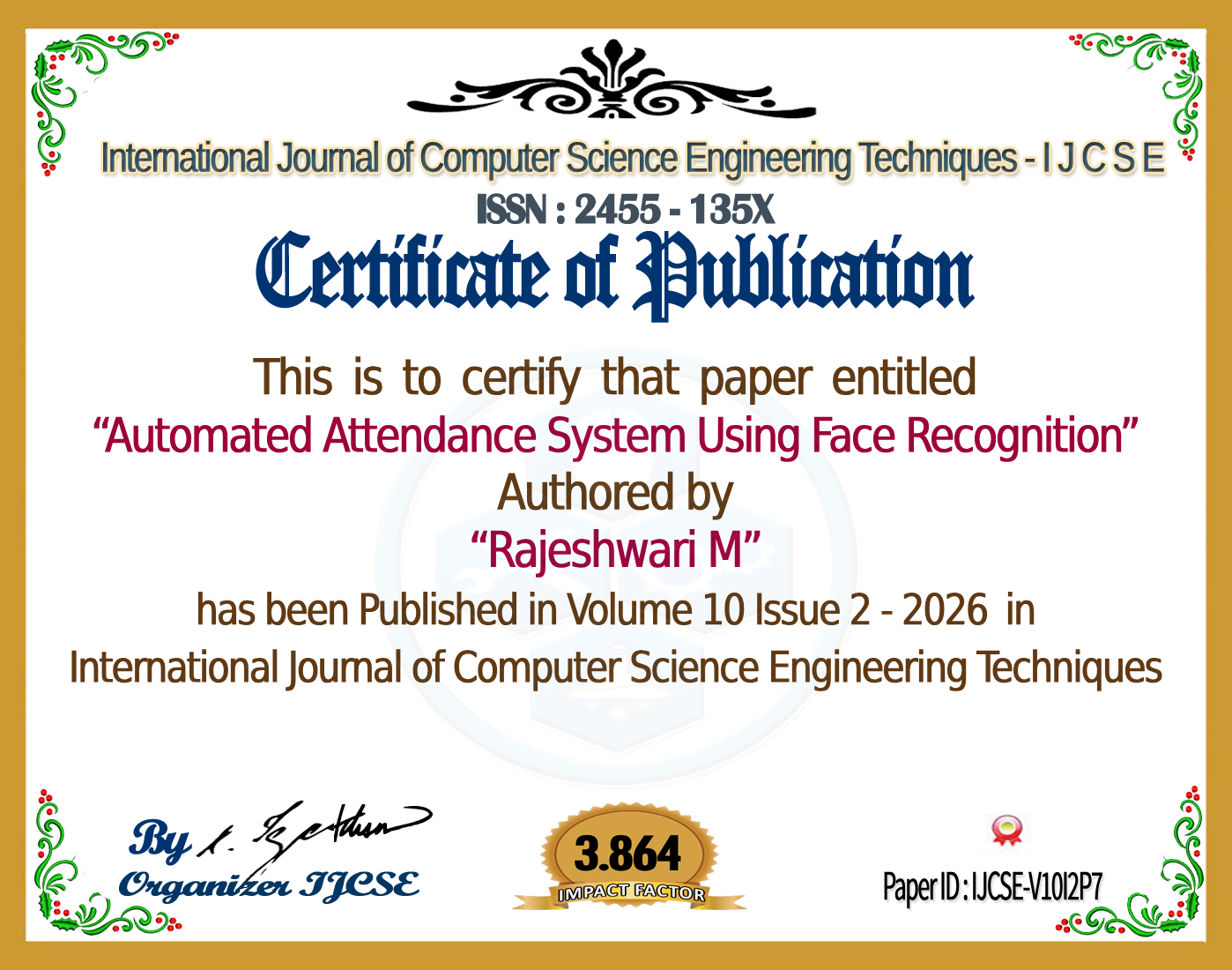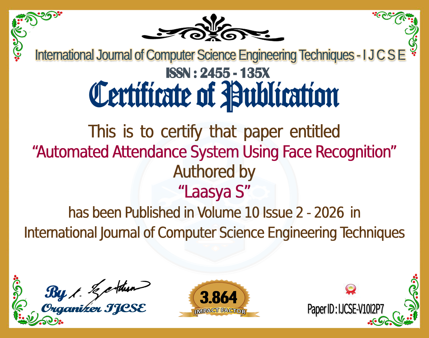 Automated Attendance System Using Face Recognition | IJCSE Volume 10 – Issue 2 | IJCSE-V10I2P7