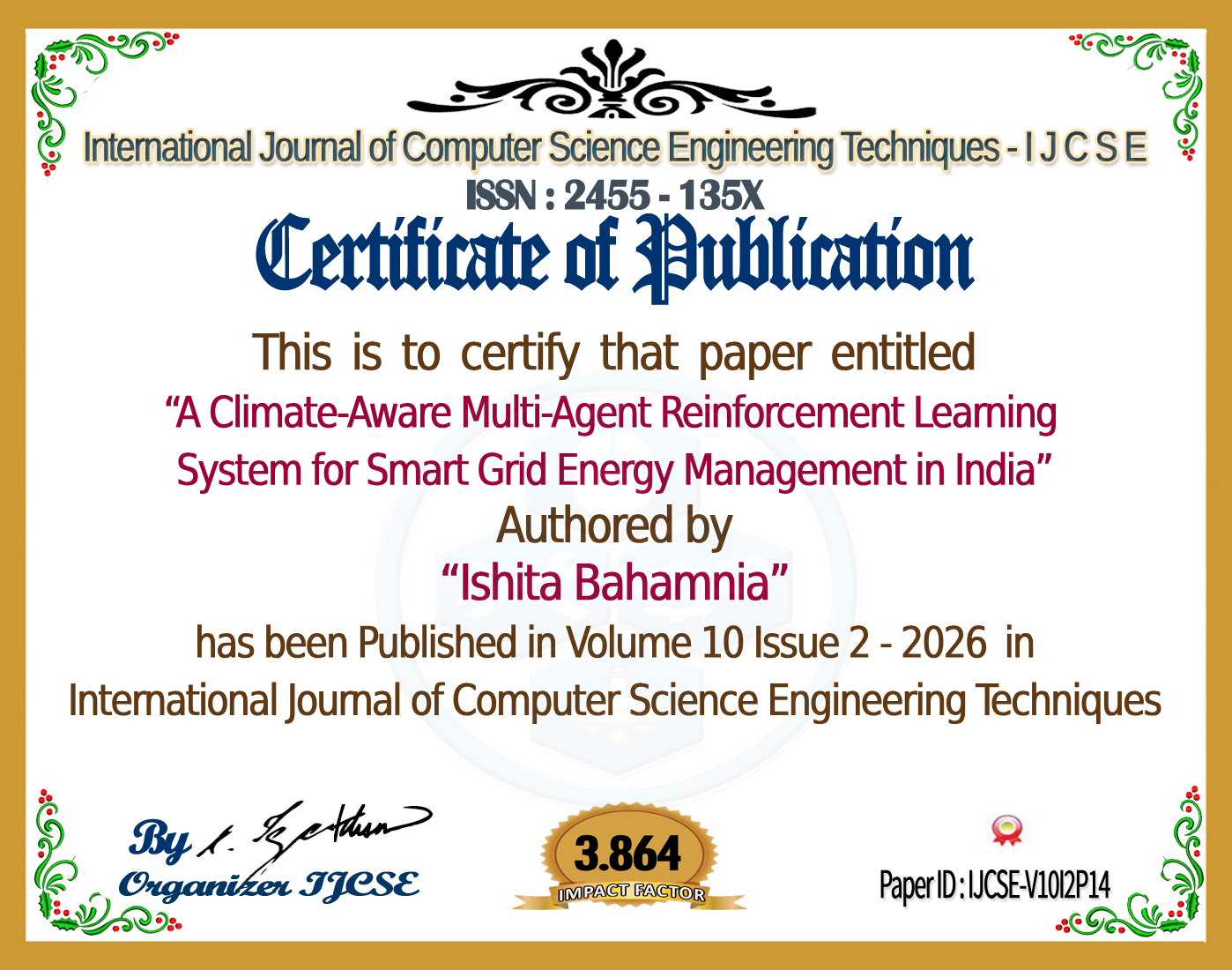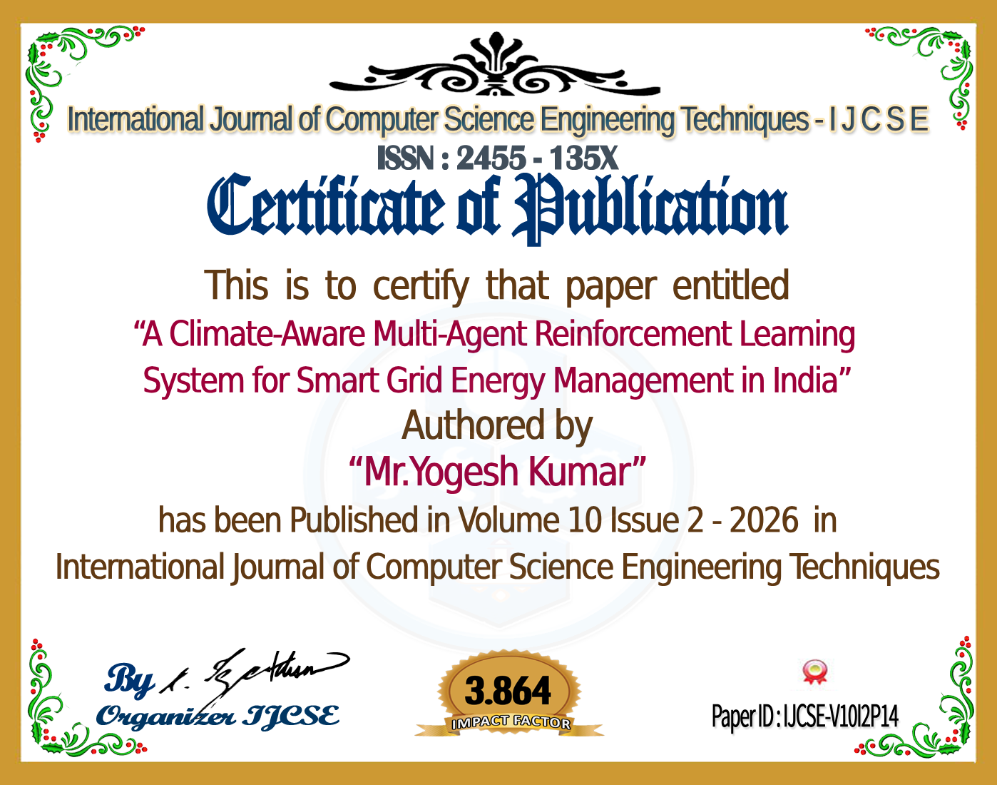 A Climate-Aware Multi-Agent Reinforcement Learning System for Smart Grid Energy Management in India | IJCSE Volume 10 – Issue 2 | IJCSE-V10I2P14
