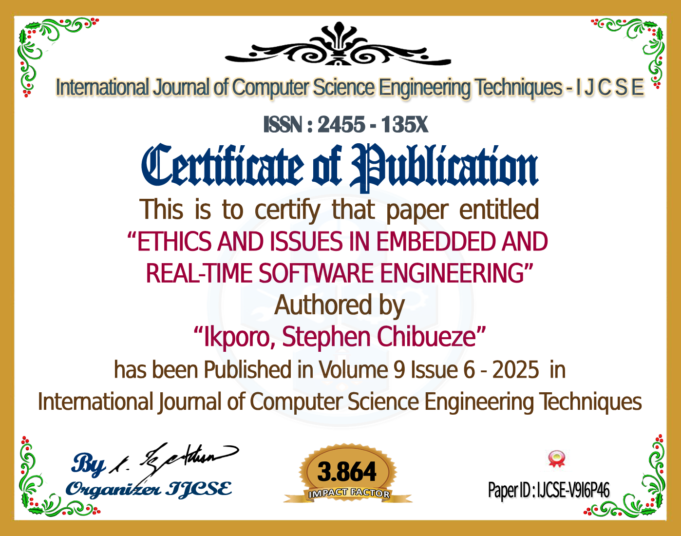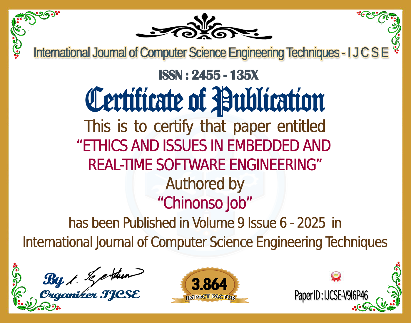 Embedded and real-time software Engineering is a very important area of study that supports crucial systems in many sectors, like transportation, healthcare, industrial automation, and aerospace. This AI software is implemented with high precision and safety, which makes them reliable and adds good performance. The designing part of this type of system is more than its technicality. The engineer needs to learn about social, ethical, environmental, and regulatory aspects in detail. This study highlights the importance of systems, with an emphasis on professional and ethical obligations that govern their design. It looks into their concerns, like algorithmic bias, data privacy, general regulatory compliance, and sustainability. In this research, a real-life case study, in addition to the Boeing 737 MAX crashes and Volkswagenās emission issues, was evaluated to show the damage of ethical lapses in embedded systems. This aids in reinforcing the importance of ethical design methods by the use of testing, obeying regulatory rules, and sustainability planning in system Implementation. The study suggests a good and forward-thinking solution to the new issues in the industry, which employs development principles that are clear and understandable, supporting interdisciplinary collaboration, and deploying a sustainable framework in the system lifecycle. Furthermore, it explains why accountability, training in ethics, and strong governance are important. The aim is to suggest a guild that not only handles present issues but also prepares real-time system developers for the future needs of this important field.