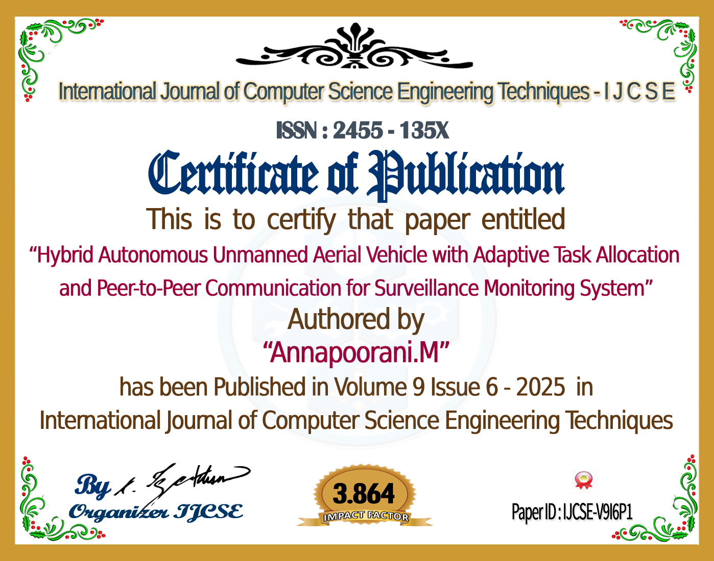 Hybrid Autonomous Unmanned Aerial Vehicle with Adaptive Task Allocation and Peer-to-Peer Communication for Surveillance Monitoring System | IJCSE Volume 9 â Issue 6 | IJCSE-V9I6P1