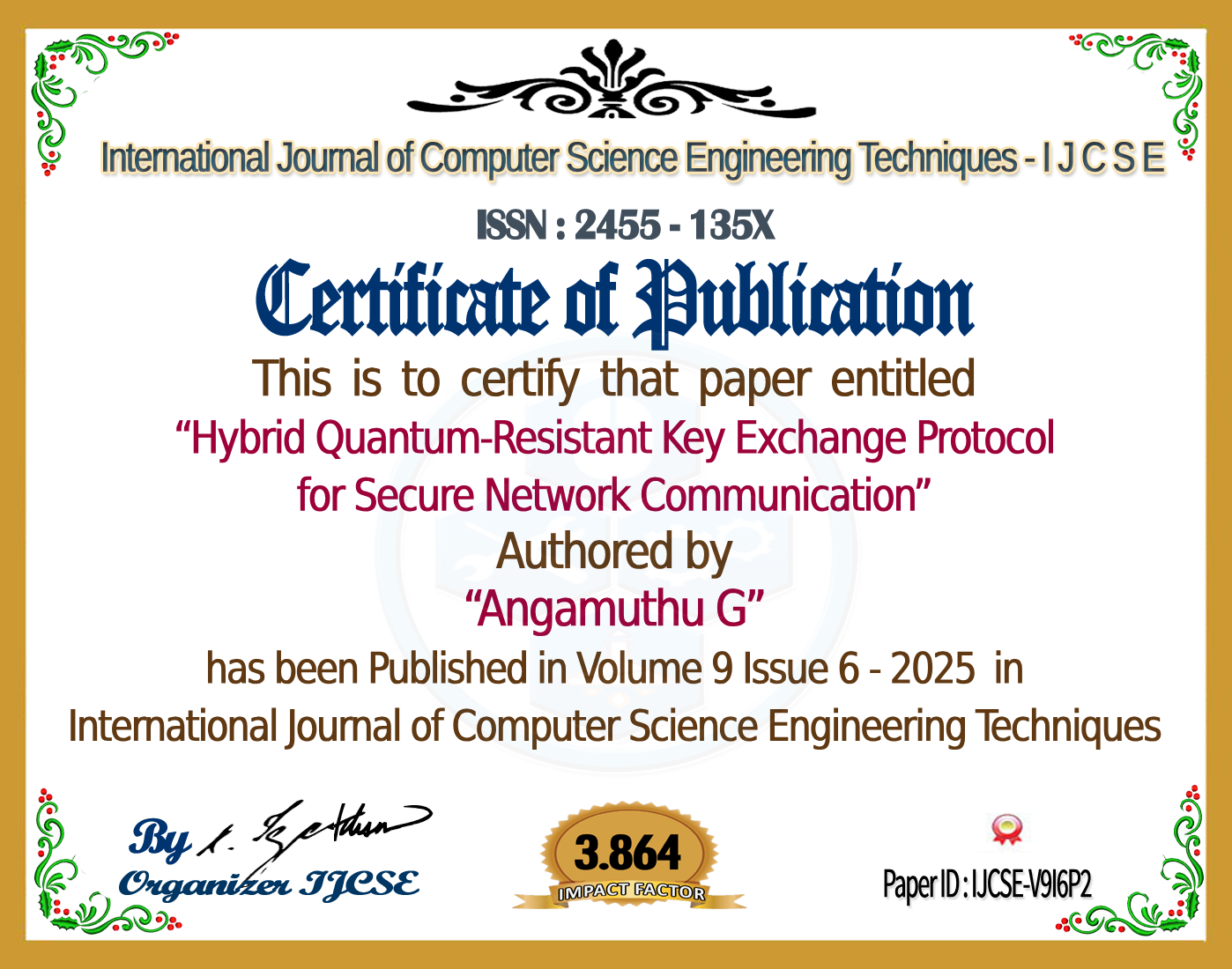 Hybrid Quantum-Resistant Key Exchange Protocol for Secure Network Communication | IJCSE Volume 9 â Issue 6 | IJCSE-V9I6P2
