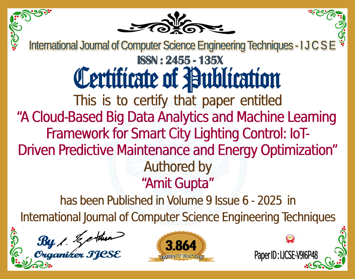 A Cloud-Based Big Data Analytics and Machine Learning Framework for Smart City Lighting Control: IoT-Driven Predictive Maintenance and Energy Optimization | IJCSE Volume 9 â Issue 6 | IJCSE-V9I6P48