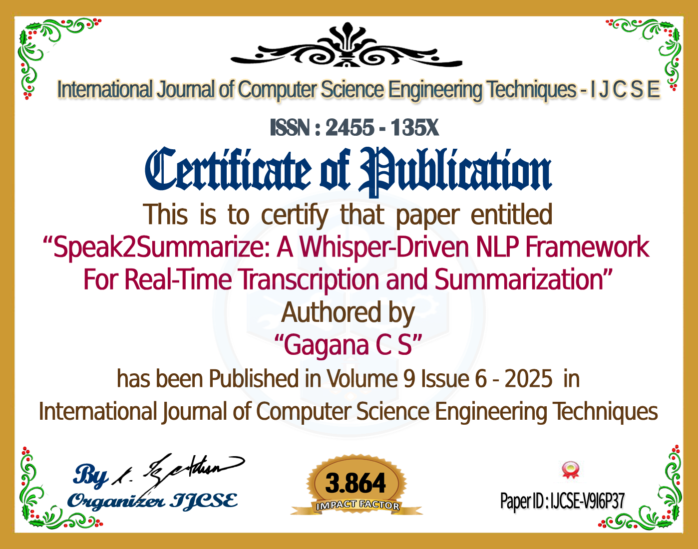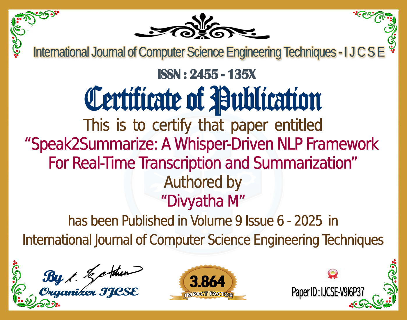 This system reduces the time required to review long content and provides a practical solution for students, educators, professionals, and anyone who regularly works with spoken information. By automating transcription and summarization, Speak2Summarize improves productivity, enhances accessibility, and simplifies the process of understanding lengthy audio- visual material.
